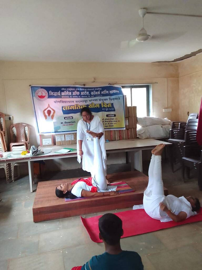 The function began with a brief introduction to Yoga Day by Prof. Sangewar Santosh. A brief introduction of the guests, Smt. Vidyabai sathe , Certified Yoga trainer with Vidyadham Yog Kutir, Badlapur. The chief guests were felicitated by Prof. Dr Ankush Aundhkar and Principal Dr R. P. Paul respectively. Yoga Day is celebrated among the youth and children to make them understand the importance of Yoga in their life. It helps the students understand how to maintain harmony between body and mind.